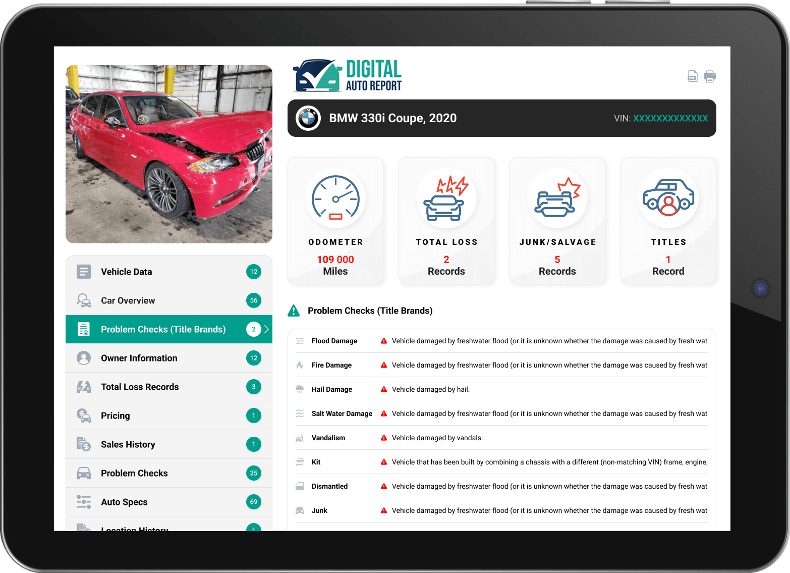Our reports include information like Junk/Salvage/Total Loss, Title Records, Brand Records, Prior Theft Records, Odometer Readings, and much more. We provide all the information you need to make a good decision about a vehicle!
